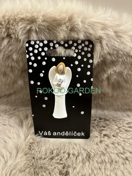 Drobný andělíček s bílými křídly a jemným výrazem drží ve svých rukou stříbrnou kytku – symbol něhy, čistoty a tiché péče. Jeho elegantní bílý vzhled a malá velikost 6 cm z něj činí ideální talisman ochrany a klidu.