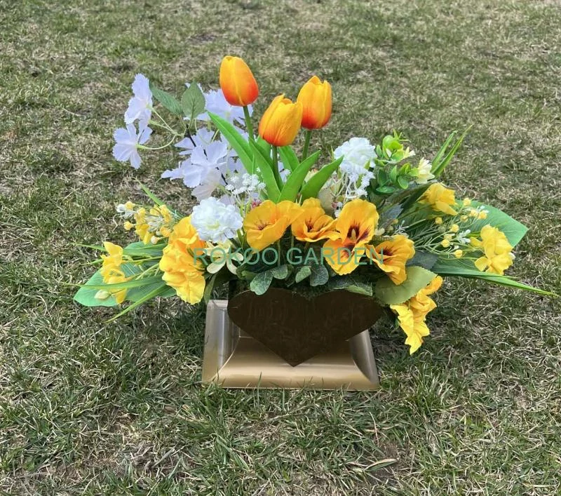 Vyjádřete úctu a vzpomínku skrze barvy jara. Toto velkorysé pietní aranžmá v nádobě ve tvaru zlatého srdce je navrženo jako důstojná a nepřehlédnutelná ozdoba místa posledního odpočinku. Kombinace tulipánů, narcisů, frézií a macešek vnáší na hřbitov jas a naději, zatímco zlatý podklad dodává celku punc výjimečnosti.